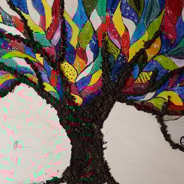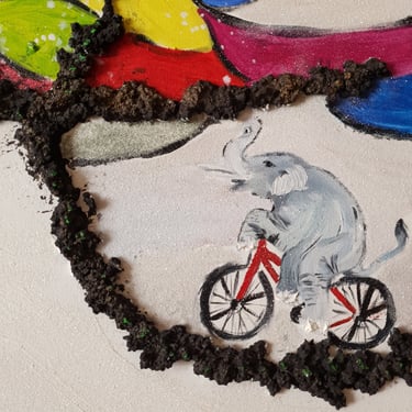 Esta obra nace del amor y el desafío. Un elefante en bicicleta, subiendo por las raíces de un árbol multicolor, parece un delirio... pero fue una promesa. “¿No vas a pintar un elefante en un árbol?” — dijo él, entre risas, sin saber que estaba sembrando la semilla de esta creación.